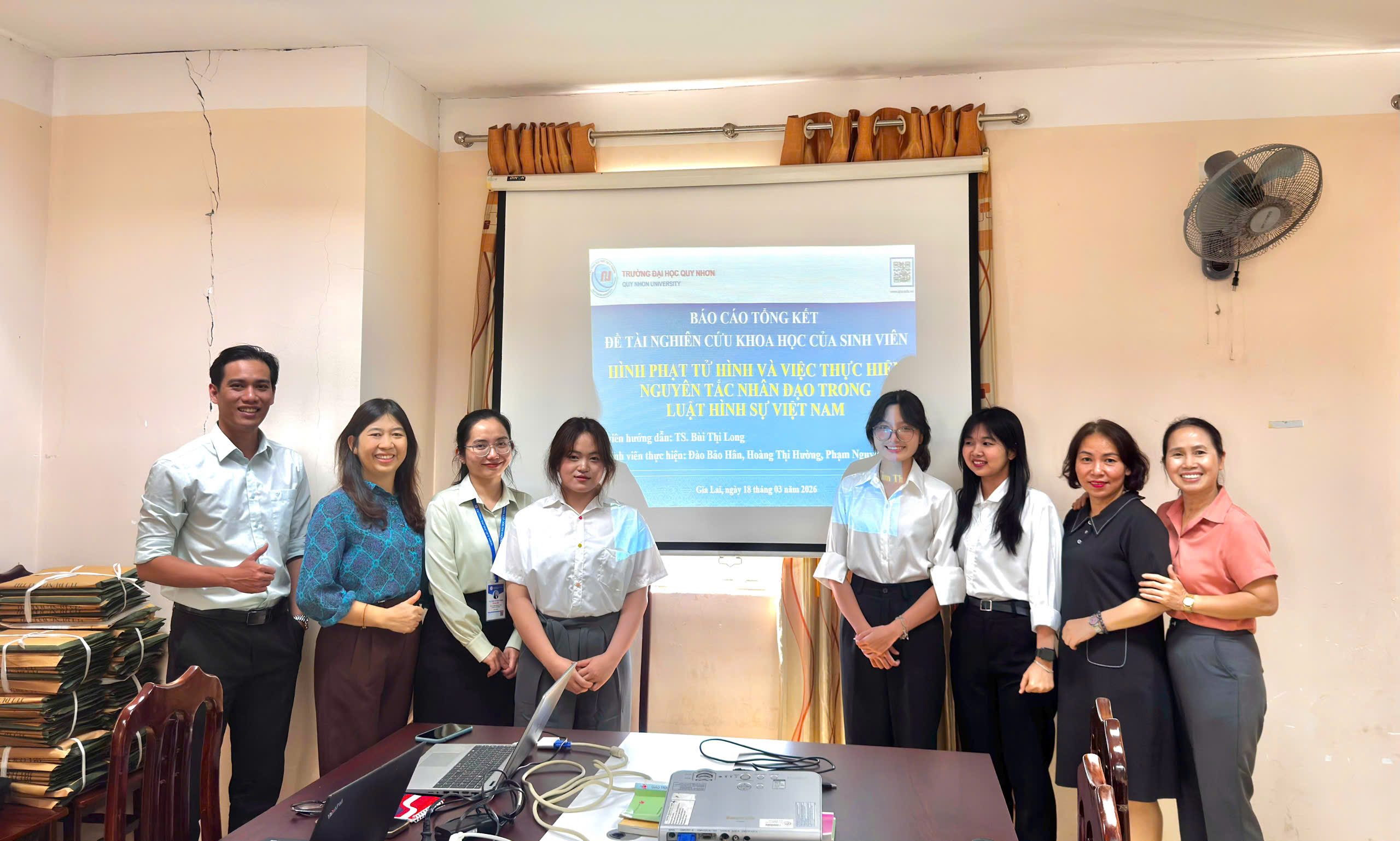 Vào các ngày 18/3 và 20/3/2026, công tác nghiệm thu đề tài nghiên cứu khoa học sinh viên cấp trường đã được ngành Luật, thuộc Khoa Lý luận chính trị - Luật và Quản lý nhà nước (Đại học Quy Nhơn) triển khai thành công. Dưới sự làm việc nghiêm túc và đúng quy chế của các Hội đồng khoa học gồm những chuyên gia giàu kinh nghiệm, nhiều công trình nghiên cứu đã được ghi nhận. Đặc biệt, các đề tài năm nay không chỉ đảm bảo chặt chẽ về phương pháp luận mà còn thể hiện rõ nét giá trị thực tiễn và hàm lượng khoa học cao. Cụ thể: